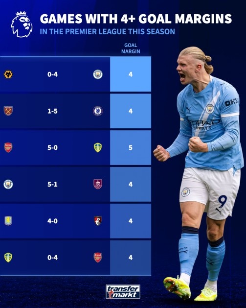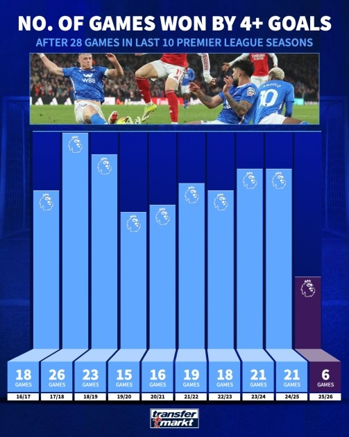 在已经进行的28轮比赛中,只有六次出现球队净胜四球或以上。此外,只有一场比赛净胜五球或以上。曼城在赛季初以4-0击败狼队,并在去年九月主场以5-1战胜伯恩利。领头羊阿森纳在主客场分别以5-0和4-0击败了利兹联。切尔西在赛季初以5-1击败西汉姆联,维拉在去年十一月以4-0击败伯恩茅斯。